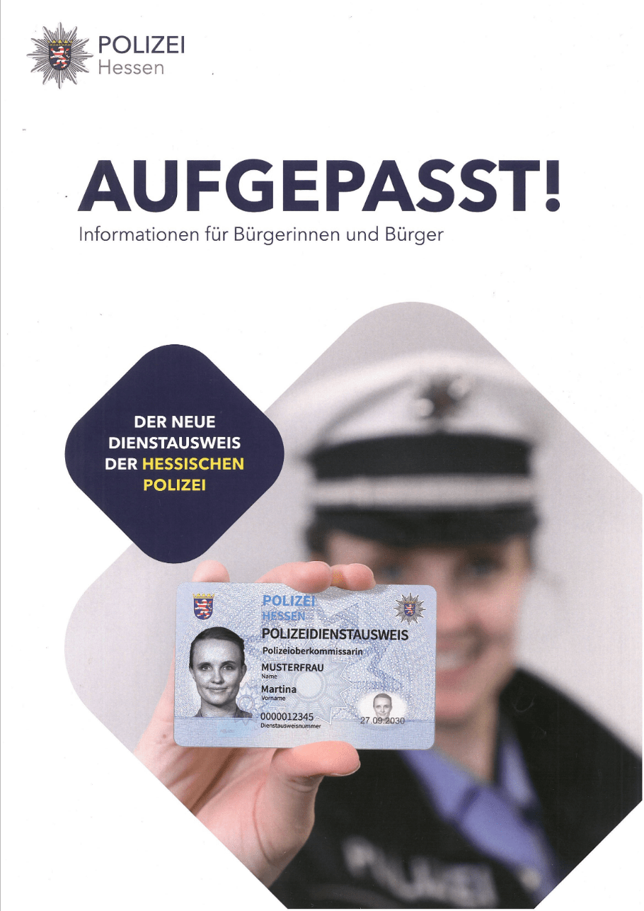 Die Polizei Hessen hat einen neuen Dienstausweis eingeführt. Bitte nehmen Sie diesen zur Kenntnis. Anbei finden Sie ein entsprechendes Foto.